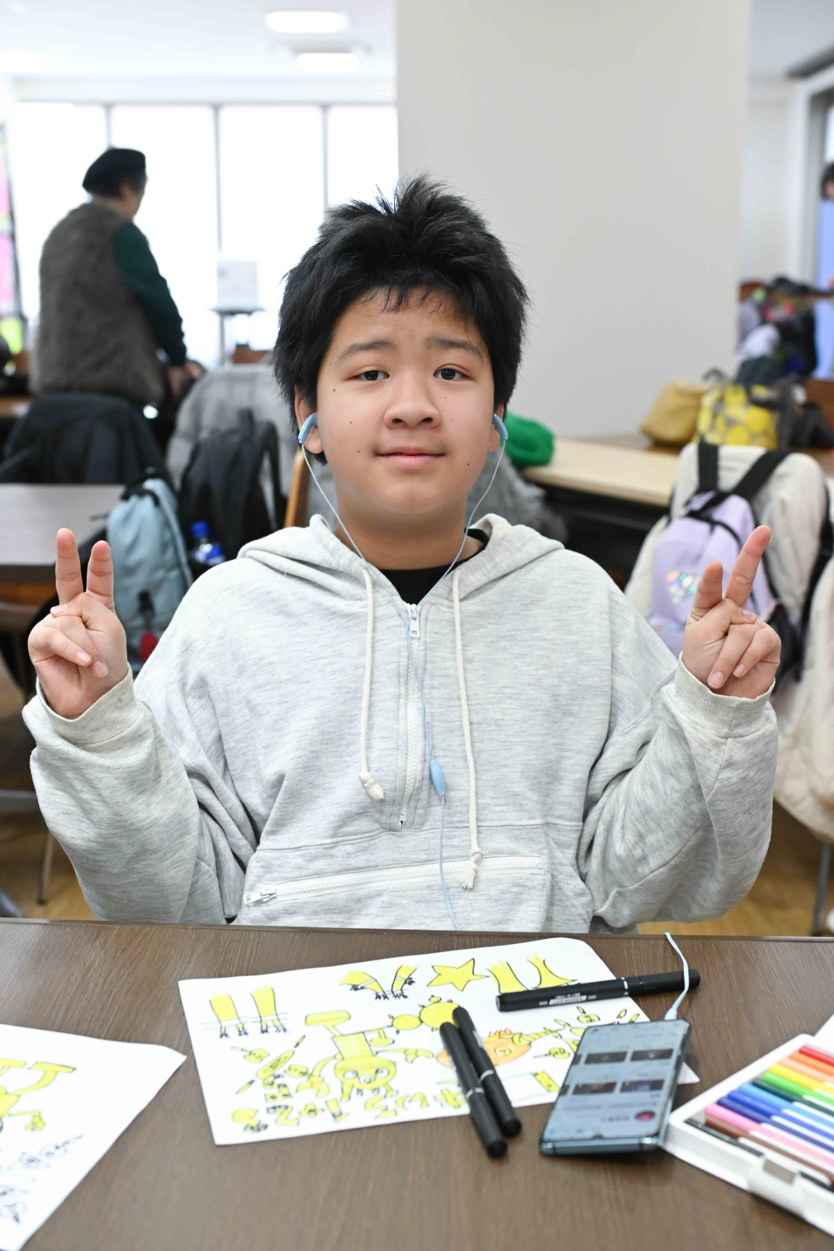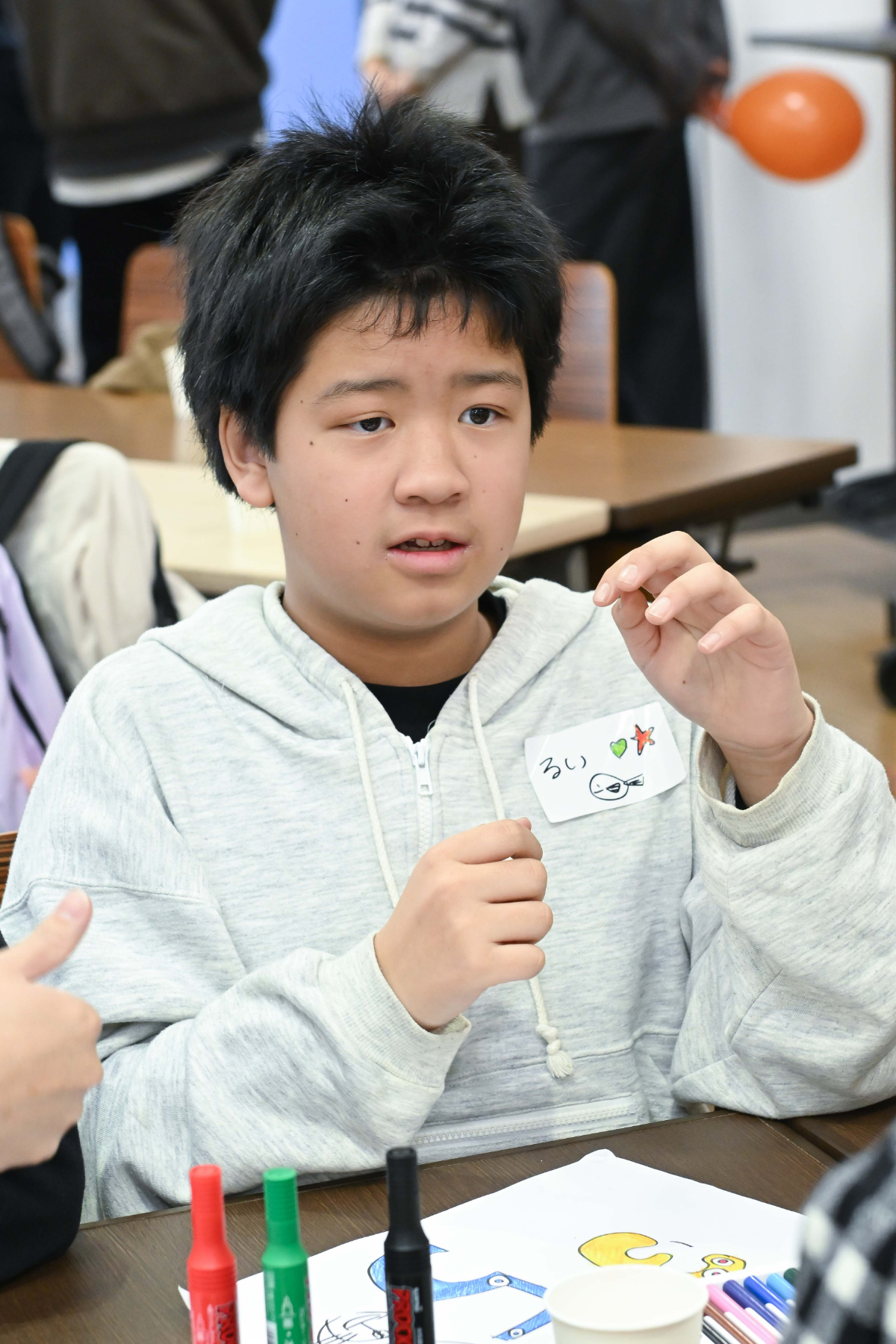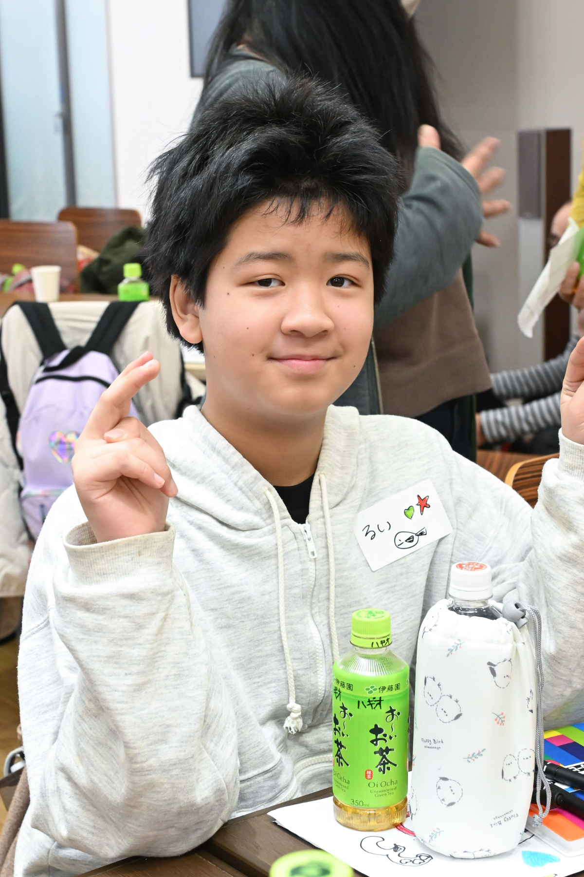笑顔で自分の名前が呼ばれると嬉しくて笑顔になる、好きなキャラクターのぬいぐるみ・オモチャで話しかけても嬉しくて笑顔になる、絵画・工作してても楽しくて笑顔になる